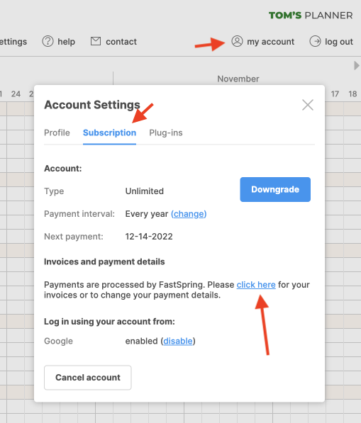 To get the invoices of your past payments, log in at plan.tomsplanner.com, click on the ‘my account’ link in the right top corner of the tool, open the subscription tab, click the link as circled in the screenshot below and follow the instructions: